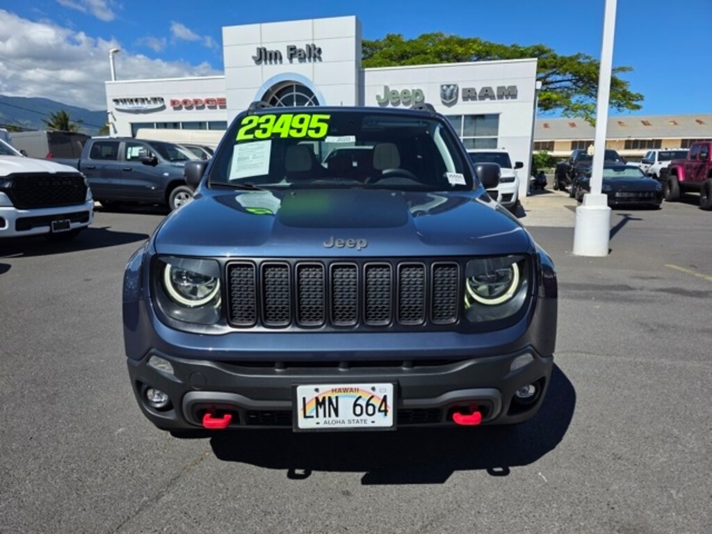 This Jeep Renegade has many features and is well equipped including Luxury Group III (DISC) (Bi-Function LED Projector Headlamps, Dedicated LED Daytime Running Lamps, Front Seat Back Map Pockets, LED Cornering Fog Lamps, LED Taillamps, and Premium Leather Trimmed Bucket Seats), Quick Order Package 22C (177HP Power Rating), Sun & Sound Group (DISC) (Dual-Pane Panoramic Power Sunroof and Kenwood Premium Audio System), Trailer Tow Group (4 Pin Wiring Harness and Class III Receiver Hitch), 17" x 6.5" Aluminum Wheels, 4-Wheel Disc Brakes, 4.585 Final Drive Ratio, 6 Speakers, ABS brakes, Air Conditioning, Alloy wheels, AM/FM radio: SiriusXM, Anti-whiplash front head restraints, Apple CarPlay/Android Auto, Auto-dimming Rear-View mirror, Automatic temperature control, Brake assist, Compass, Delay-off headlights, Driver door bin, Driver vanity mirror, Dual front impact airbags, Dual front side impact airbags, Electronic Stability Control, Emergency communication system: SiriusXM Guardian, Four wheel independent suspension, Front anti-roll bar, Front Bucket Seats, Front Center Armrest, Front dual zone A/C, Front fog lights, Front reading lights, Fully automatic headlights, Heated door mirrors, Heated front seats, Heated steering wheel, Illuminated entry, Knee airbag, Leather Shift Knob, Leather steering wheel, Low tire pressure warning, Navigation System, Normal Duty Suspension, Occupant sensing airbag, Outside temperature display, Overhead airbag, Panic alarm, ParkView Rear Back-Up Camera, Passenger door bin, Passenger vanity mirror, Power door mirrors, Power driver seat, Power steering, Power windows, Premium Cloth Low-Back Bucket Seats, Radio data system, Radio: Uconnect 4C Nav w/8.4" Display, Rain sensing wipers, Rear anti-roll bar, Rear seat center armrest, Rear window defroster, Rear window wiper, Remote keyless entry, Roof rack: rails only, Security system, Speed control, Split folding rear seat, Spoiler, Steering wheel mounted audio controls, Stop-Start Multiple VSM System, Tachometer, Telescoping steering wheel, Tilt steering wheel, Traction control, Trip computer, Turn signal indicator mirrors, Variably intermittent wipers, and Voltmeter. Slate Blue Pearlcoat 2021 Jeep Renegade Trailhawk 4WD 9-Speed 948TE Automatic 1.3L I4